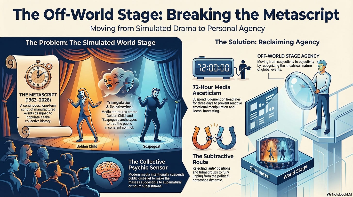 On the goal of the “Off-world Stage” perspective: “The off-world stage perspective is a view on world events that is inclusive of the awareness of not only the world stage paradigm as defined by previous fakery, but the capacity of media to simulate events.”